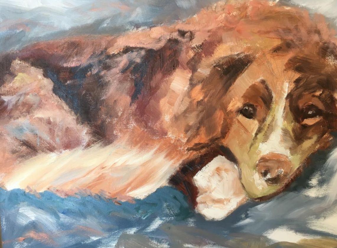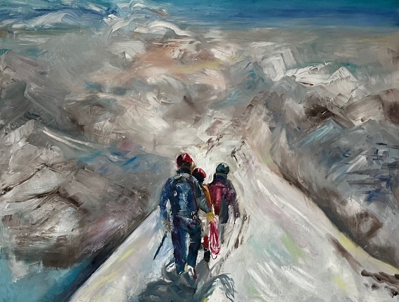 Wir malen in der sogenannten alla prima-Technik. Das bedeutet: Wir tragen die Farben nicht - wie in der klassischen Ölmalerei - in mehreren Schichten auf, sondern wir mischen den gewünschten Farbton auf einer Palette oder direkt auf dem Malgrund. Wir erstellen das Bild in nur einer Malschicht.